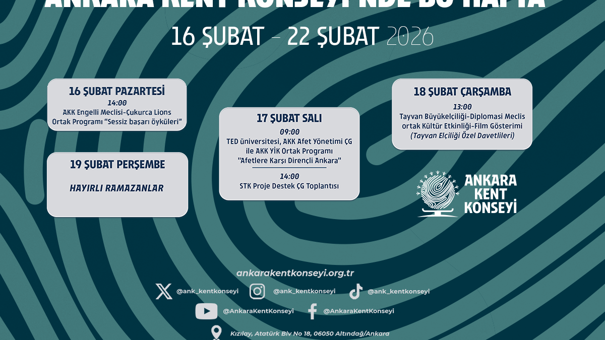 16/02/2026Ankara Kent Konseyi olarak; eğitimden hayvan haklarına, kent estetiğinden kültürel mirasa, gençlik çalışmalarından sporcu sağlığına kadar uzanan geniş bir yelpazede düzenlediğimiz etkinliklerle, 102 yıllık Başkent’imizin kültürel, sosyal ve stratejik gelişimine katkı sunmaya devam ediyoruz.