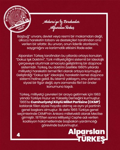 1960’lardan itibaren milliyetçi hareketin kurucu ve lider figürü olarak öne çıktı. Fikirleri ve teşkilatlanma anlayışıyla ülkücü hareketin merkezinde yer aldı. Partiyi ve hareketi bir “dava” etrafında toplaması, ona “başbuğ” (büyük lider) sıfatını kazandırdı.
