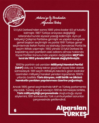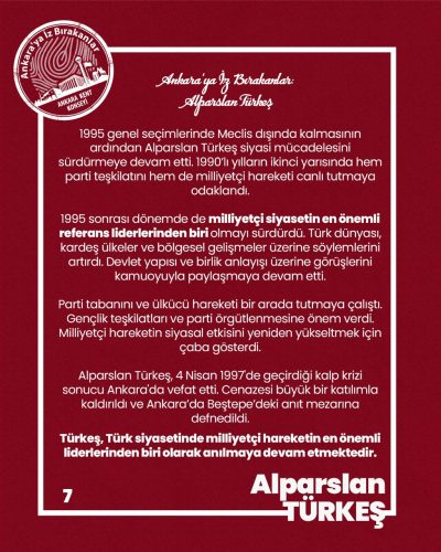 1995 genel seçimlerinde Meclis dışında kalmasının ardından Alparslan Türkeş siyasi mücadelesini sürdürmeye devam etti. 1990’lı yılların ikinci yarısında hem parti teşkilatını hem de milliyetçi hareketi canlı tutmaya odaklandı.