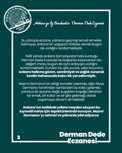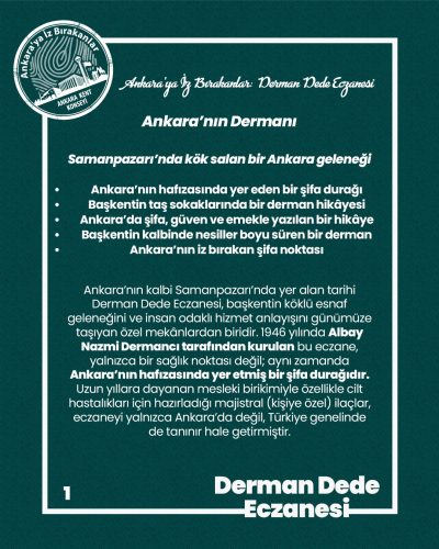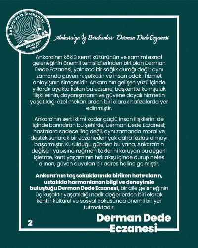 Ankara’nın taş sokaklarında biriken hatıraların, ustalıkla harmanlanan bilgi ve deneyimle buluştuğu Derman Dede Eczanesi, bir aile geleneğinin üç kuşaktır yaşatıldığı nadir değerlerden biri olarak kentin kültürel ve sosyal dokusunda önemli bir yer tutmaktadır. Bu yönüyle eczane, yalnızca geçmişi temsil etmekle kalmayıp, Ankara’nın yaşayan hafızası olarak bugün de varlığını sürdürmektedir.