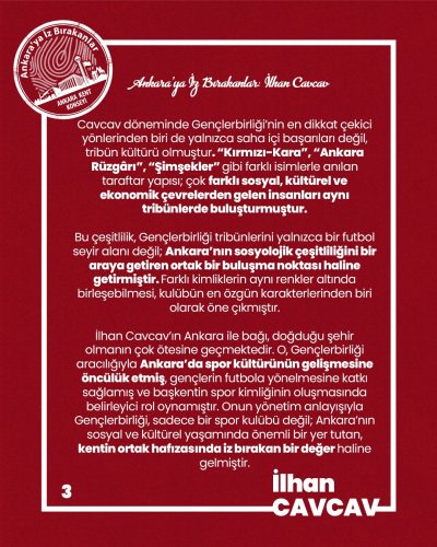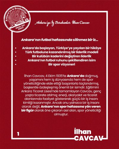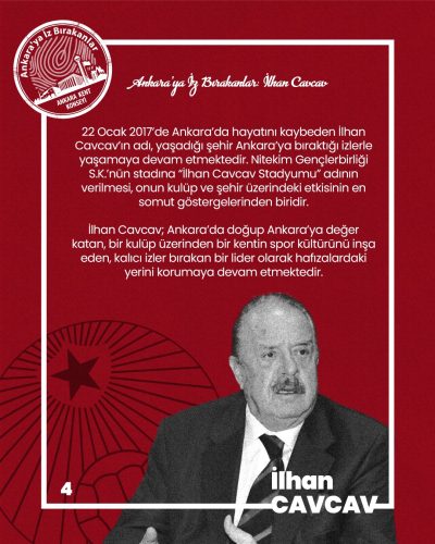İlhan Cavcav; Ankara’da doğup Ankara’ya değer katan, bir kulüp üzerinden bir kentin spor kültürünü inşa eden, kalıcı izler bırakan bir lider olarak hafızalardaki yerini korumaya devam etmektedir.