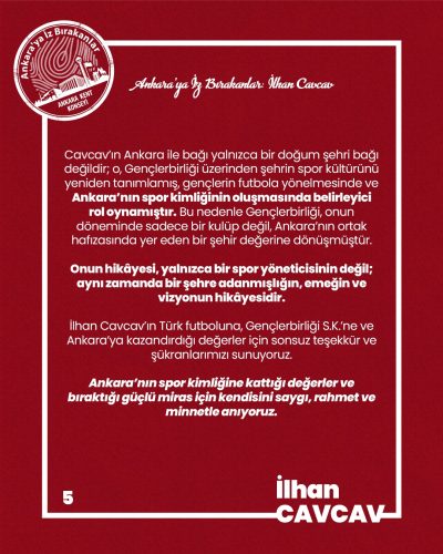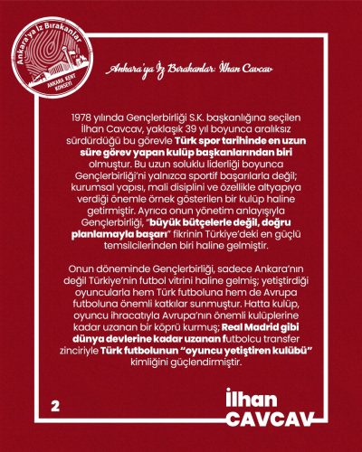 İlhan Cavcav’ın Türk futboluna, Gençlerbirliği S.K.’ne ve Ankara’ya kazandırdığı değerler için sonsuz teşekkür ve şükranlarımızı sunuyoruz.