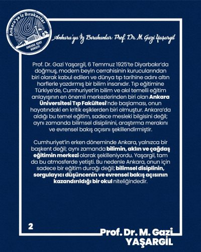 Prof. Dr. Gazi Yaşargil, 6 Temmuz 1925’te Diyarbakır’da doğmuş, modern beyin cerrahisinin kurucularından biri olarak kabul edilen ve dünya tıp tarihine adını altın harflerle yazdırmış bir bilim insanıdır. Tıp eğitimine Türkiye’de, Cumhuriyet’in bilim ve akıl temelli eğitim anlayışının en önemli merkezlerinden biri olan Ankara Üniversitesi Tıp Fakültesi’nde başlaması, onun hayatındaki en kritik eşiklerden biri olmuştur. Ankara’da aldığı bu temel eğitim, sadece mesleki bilgisini değil; aynı zamanda bilimsel disiplinini, araştırma merakını ve evrensel bakış açısını şekillendirmiştir.