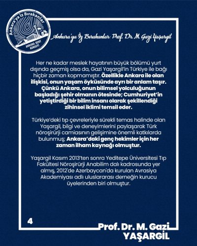 Her ne kadar meslek hayatının büyük bölümü yurt dışında geçmiş olsa da, Gazi Yaşargil’in Türkiye ile bağı hiçbir zaman kopmamıştır. Özellikle Ankara ile olan ilişkisi, onun yaşam öyküsünde ayrı bir anlam taşır. Çünkü Ankara, onun bilimsel yolculuğunun başladığı şehir olmanın ötesinde; Cumhuriyet’in yetiştirdiği bir bilim insanı olarak şekillendiği zihinsel iklimi temsil eder.