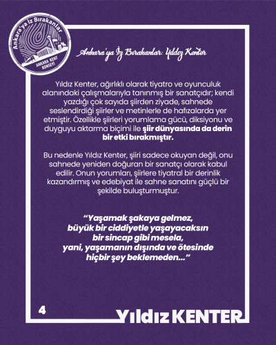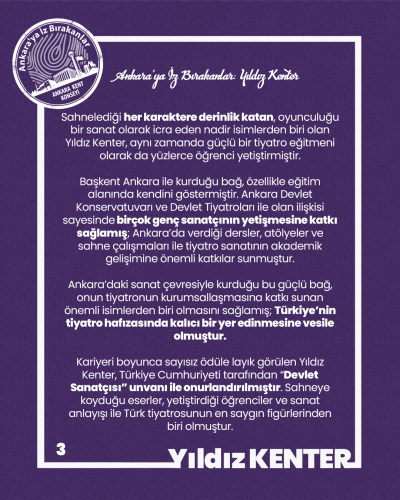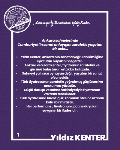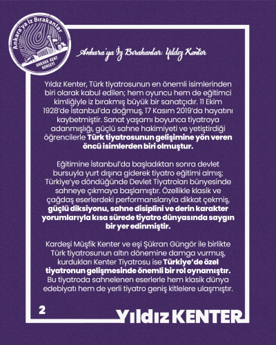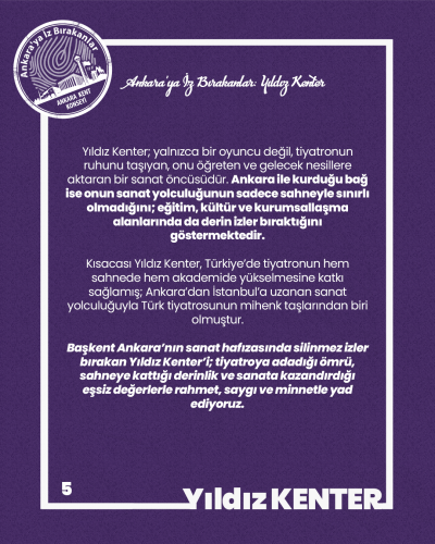 Başkent Ankara’nın sanat hafızasında silinmez izler bırakan Yıldız Kenter’i; tiyatroya adadığı ömrü, sahneye kattığı derinlik ve sanata kazandırdığı eşsiz değerlerle rahmet, saygı ve minnetle yad ediyoruz.