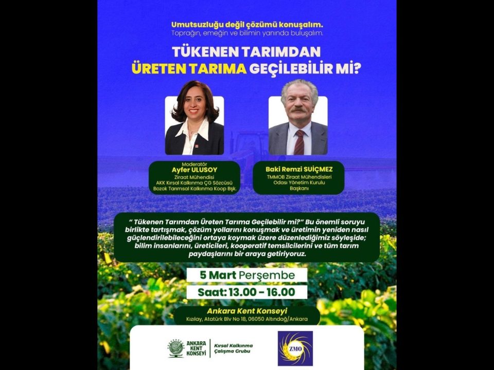 Ankara Kent Konseyi Kırsal Kalkınma Çalışma Grubu tarafından düzenlenen “Tükenen Tarımdan Üreten Tarıma Geçilebilir mi?” başlıklı programda, tarımın mevcut durumu […]