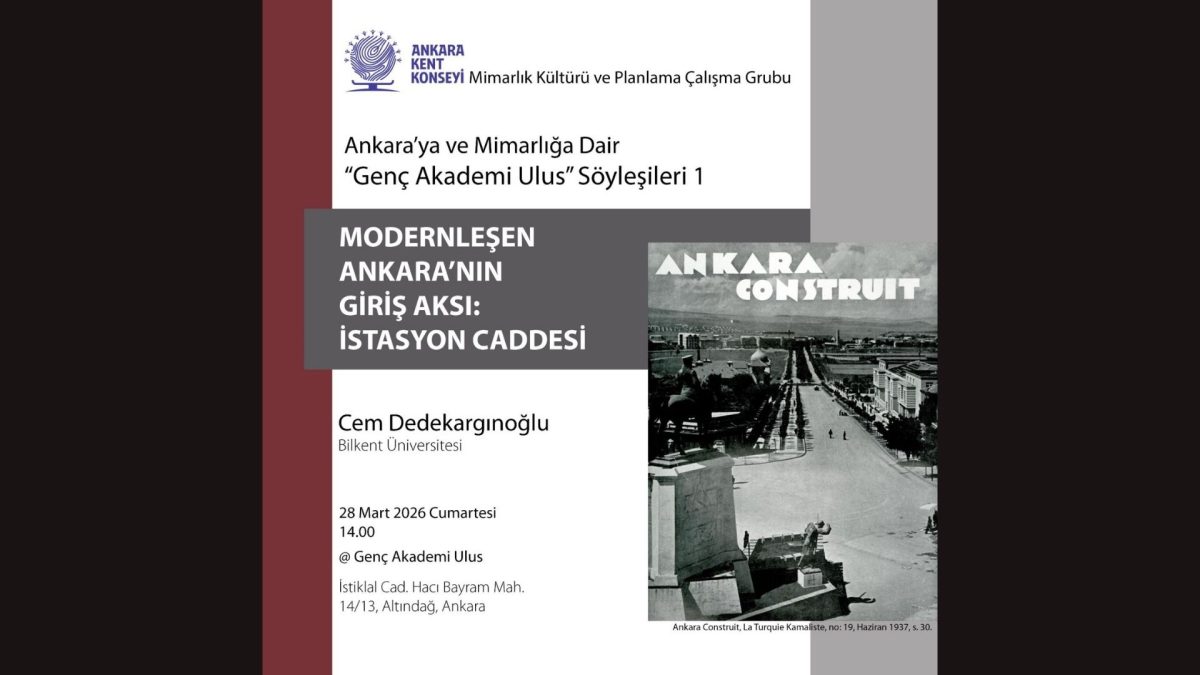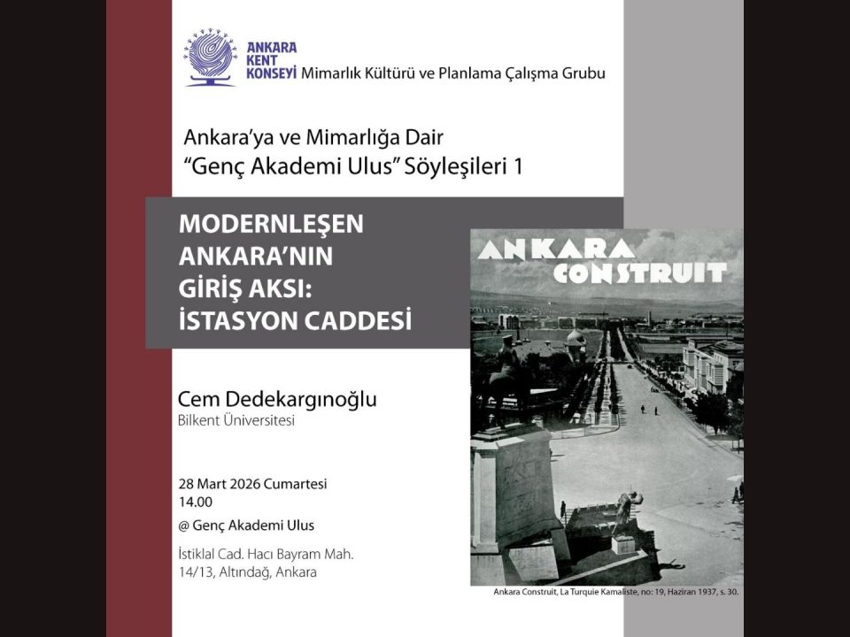 25/03/2026 25/03/2026Kategoriler Haberler Mimarlık Kültürü Çalışma Grubu Mimarlık Kültürü Ve Planlama Alt Çalışma GrubuGenç Akademi Ulus SöyleşileriAnkara Kent Konseyi Mimarlık Kültürü ve Planlama Çalışma Grubu tarafından düzenlenen “Genç Akademi Ulus Söyleşileri” kapsamında, Ankara’nın modernleşme sürecine ışık […]